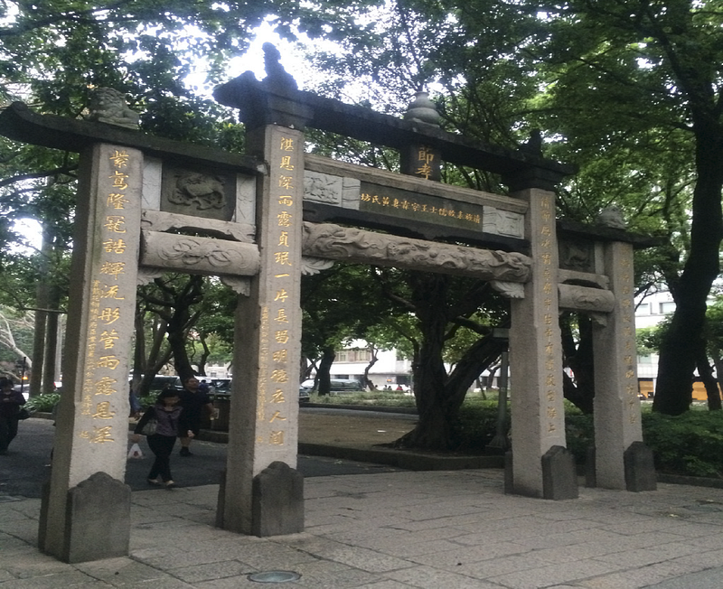 落成於1887 年。紀念清朝時期貢生洪騰雲先生捐錢替當時北部考生興建考棚的義舉。原先位於西門附近的街道(今衡陽路一帶),在日本時期由於市區改正計劃遷移至新公園,但頂部因此受損,且聖旨亦不知所蹤。不過今日坊前多了自台灣布政使司衙門的石獅。