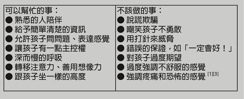 輔導師可以進一步邀請孩子提問,有時兄弟姊妹也可以參與,一起完成某項任務,如唱歌、或互相吹泡泡、或故事接龍,藉此分散注意力。另外,孩子之所以恐懼,一部分是因為他們在醫療過程中常是未受重視、受人擺佈的,無法決定要或不要。國外有兒童醫院在吸入型麻醉藥物裡添加香精,孩子們就可選擇他們想要的口味;找回一些些掌控性,就不會那麼的無助。