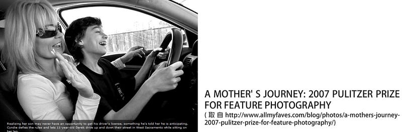 加州沙加緬度市有一份叫作Bee的地方報,以兩年的時間,替一位罹患神經纖維母細胞瘤的小孩拍攝相片,題名為A Mother’s Journey。記錄著母子間的高興、難過、開心、挫折,直到葬禮。中間有一張是小孩坐在母親的腿上,抓方向盤開車……很多照片告訴我們,如何去度過孩子最後的那段時光。生氣、哭泣或彼此鼓勵;我們怎麼面對,可以很不一樣。