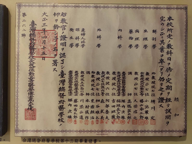 在謝巧烽與他的博愛醫院的隔壁,便是長源醫院。踏入長源醫院時,那厚重的歷史氣息立刻撲面而來。這座建築不僅是鹿港過去繁華歲月的見證,更是許家三代人在醫療與文化領域奮鬥的象徵。長源醫院的故事,要從許讀這位極具才華的醫生說起。許讀,鹿港人,自幼展現出卓越的求知欲,尤其對科學有著無限熱情。1914年,他從鹿港公學校畢業,隨即考入新成立的臺灣公立臺中中學校,成為首屆畢業生之一。在現在改建完成的長源醫院內,也留存著當年他從中學校畢業的證書。