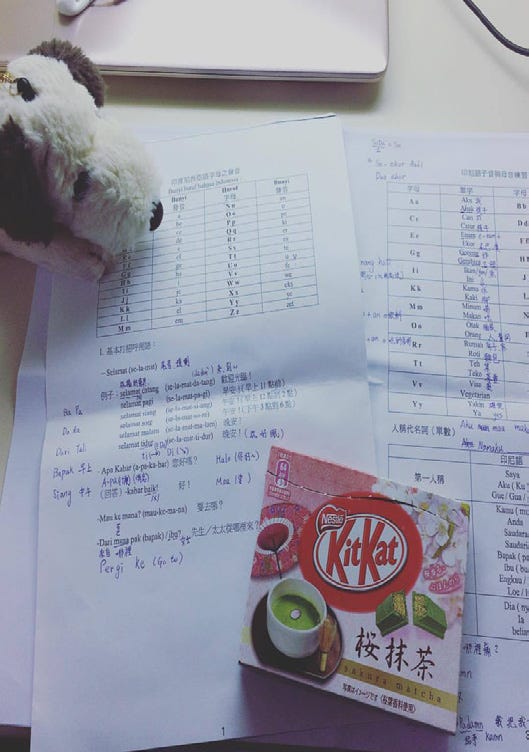 週五夜間印尼課,意外印尼文跟德文相似度破表。中文式文法X英文式文法,人生第五種語言正式入手。雖然之前其他外語的記憶總是零散,但這次為了以後可以更加應用在醫療領域上,期許自己可以更加努力學習。謝謝台大SCORP佳瑄、采媚,舉辦了這麼棒的活動;謝謝蘭欣助教總在活動出錯的時候,神救援我們還用零食餵飽我;謝謝宜潔,從沒想過我們會在這樣的時空下重逢,緣分真的很奇妙,還是說我們臭氣相投呢XD。謝謝傑生,這一切都是你起步的,認識你真的是我三生的福氣;謝謝記賢 如果不是你跟我分享你看診遇到移工的經驗,我恐怕還不願意好好踏出第一步,寫下這一篇 。期望自己可以持續這份心學習,也感謝昨天的自己終於為了自己關心的議題踏出第一步了。