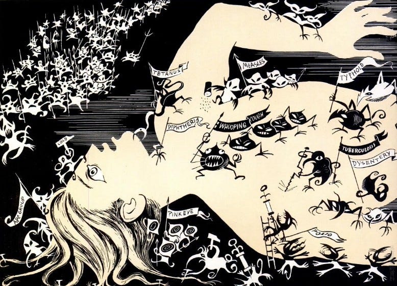 從此,我們可以利用一連串的隱喻來去形容一場瘟疫:細胞構築了稱為人體的共同體,他們彼此獨立又彼此需要,以確保人體的存續,避免自身單獨地受到他者的侵害。病原體則被視為他者,而身上可憐的細胞便成為免疫系統需要保護的對象。病原體在體內殖民細胞為其繁衍以壯大勢力,而免疫系統就有如警察或軍隊,巡邏監視細胞是否安守本分,有無謀通匪諜。細胞自身則要遵紀手法,正常地發揮其在社會上的功能,避免被誤認成癌細胞而被取締。而平行地,我們對於外來者,如國際移工的規章制度也顯示出了免疫的特質,因為他們不同於我們,我們需要對自身進行免疫抑制,或是對其加上標籤,或是將其牽制甚至毀滅。而對內的少數群體,如文化弱勢者、精神疾病者,我們則是將其視作癌細胞,治療上要避免其擴散,或者將治療 — 同化以能夠吸收為共同體的一份子,使其得以正常進行社會所賦予的工作。而這些外來者的建構也自證了免疫系統的優越性,在政治演化上也更加地給予免疫系統更多權力,以應對更多風險。