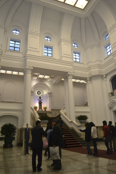 導覽動線安排群眾在挑高的敞廳拍照之後,上樓繼續參觀大禮堂。禮堂正由觀光科系的學生進行三八婦女節的特別表演,禮堂對面的臺灣虹廳則懸掛著幾幅充滿臺灣高山與城市意象的畫作。通過長廊下樓,是一系列的展覽空間,眾多志工們此起彼落地講述建築的奧妙、馬關條約的始末以及歷任總督的軌跡。多數的導覽止於蔣中正、李宗仁等人在南京總統府就任總統、副總統的一張大合照,其後的展示交予觀者自由品味。它們簡單交代了行憲後間接選舉、直接選舉產生的歷任總統及其政績,接續著是現任總統馬英九的多項施政表現及鞏固邦交國的努力,最後是與總統府這座建物同時發生的、臺灣島百年來的演變。