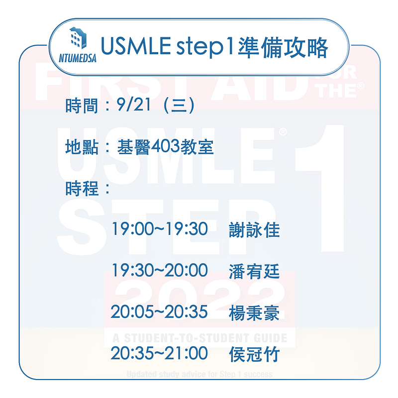 由臺大醫學系系學會學術部主辦,關於美國醫師國考USMLE step1準備攻略和實驗室交換經驗講座,在9/21晚間登場,實體和線上方式並行,先由謝詠佳、潘宥廷、楊秉豪三位講者,各自分享對於USMLE step1準備心得,第四位講者侯冠竹,則分享實驗室交換一年的經驗。