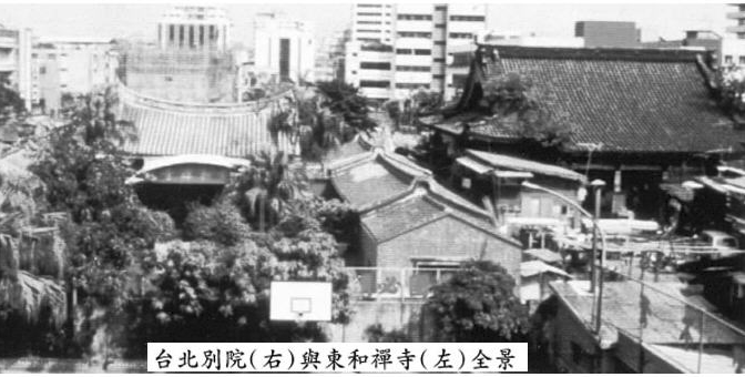 現存的東和禪寺,原本叫做觀音禪堂,是曹洞宗大本山台北別院的一部份。曹洞宗大本山台北別院,在鼎盛時期,佔地四千多公頃,四面分別是林森南路、仁愛路、丹陽街與仁愛路23 巷。相當於包括今天的東和禪寺、青少年育樂中心、以及以東的幼稚園。別院的木造結構初建於1907 年,但此一木造結構因天災毀損後,在1917 年以鋼骨水泥重建,並於1923 年、1950 年陸續興建本堂與鐘樓。在1917 年,鋼骨水泥是非常新穎的建材,而更可貴的是,曹洞宗台北別院刻意用鋼骨水泥仿木造建築興建,從現在尚存的鐘樓,仍可一窺維妙維肖的仿木造建築。在日本統治台灣的時候,禪宗五家七宗紛紛從日本來到台灣建立據點,然而,其宗教活動大多以服務在台日本人為主,而排擠台灣人的參與。