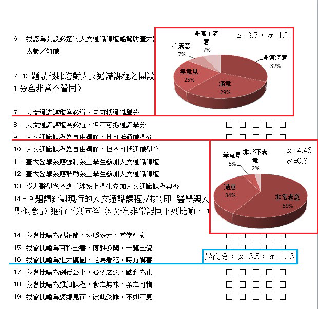 [10] 問卷第二十七題:陳彥元教授原先將「醫學與人文」的課程目的設定為「提升學生的人文素養」,後來認為無法單憑一門課提升學生素養,因此改成「提升對人文領域的興趣」,希望提升各位對於歷史、藝術、文學/社會議題的興趣。請問您認同嗎?(5分為非常同意,1分為非常不同意)平均得分3.73分,標準差1.29分。
