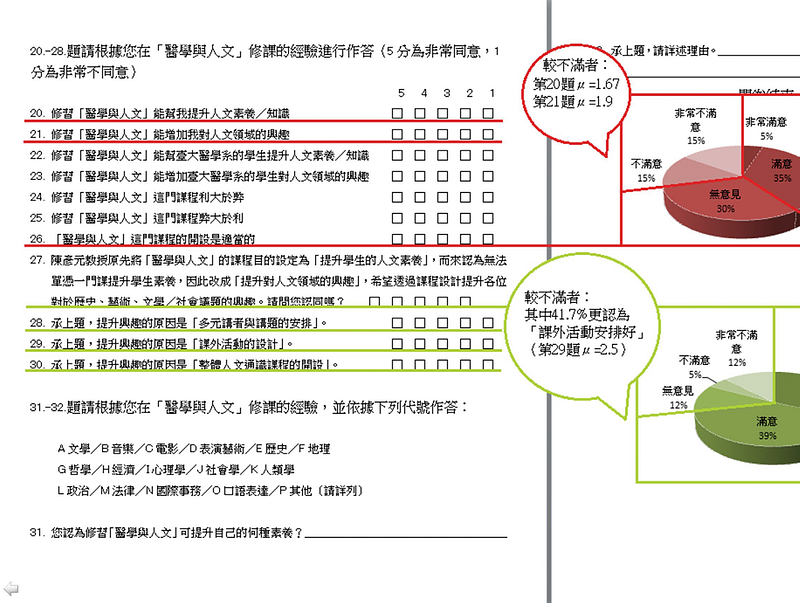 [7] 問卷第二十題:修習「醫學與人文」能幫我提升人文素養/知識(5分為非常同意,1分為非常不同意)。此子群平均得分3.5分。問卷第二十一題:修習「醫學與人文」能增加我對人文領域的興趣(5分為非常同意,1分為非常不同意)。此子群平均得分3.9分。