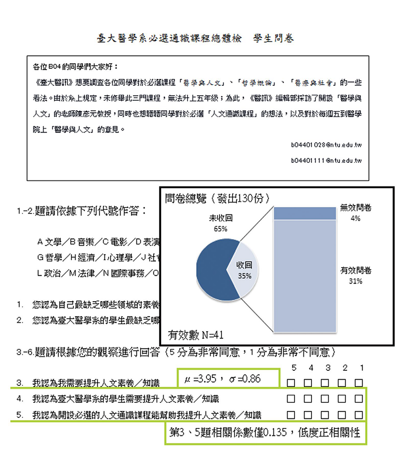 那麼,對於這樣的醫學通識課程,剛入學的大一新生們的接受度如何呢?開設成必修通識學分的形式,同學們是解讀成善意,還是認為這是種變相的強迫選修呢?為了更進一步了解系上剛入學的大一們如何看待臺大醫學系的通識教育,又如何評價首先碰到的「醫學與人文」,我們設計了一份問卷普查所有的新生,發放了130份,回收46份,其中有效問卷41份。