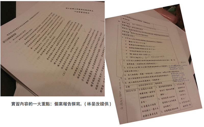 基本來說,在實習過程中都是責任制,無論實習的時間或是工作 內容,其中包含和老師及同學的 meeting。上班期間就將份內該做的事情做完,然後大致上在三點半至四點半間交班給小夜,若事情無法 在交班時間前完成則會先交班後, 再去完成自己班內任務。而每週需繳交的個案報告才是將實習過程中所學及和病患相處的情形,仔細地呈現。也因為還是學生,內外科一、 內外科二、產科和兒科都有各自的期中及期末考,平均下來三至四週 就得面臨一次大考。實習以外的見習包括,內外科會安排的刀房見習 (學習刷手和巡迴護理師工作)、 參觀洗腎中心、盲人重建院等;兒科則提供門診和加護病房見習、骨髓移植中心和社區永民發展中心參訪的機會。