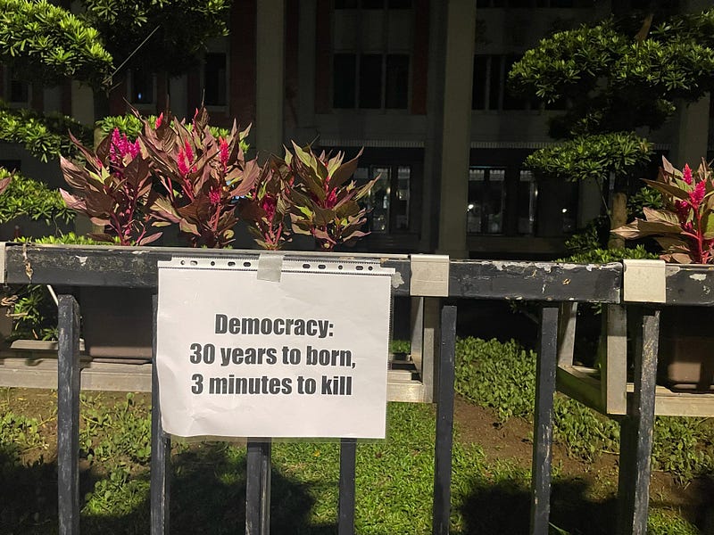 一直到期末考前幾天,我都還在路上。集會有趣的是,無論你的年齡、性別、職業,所有人只要出現在街頭,都是同樣平等的一份力。不能到場的人們送來物資,飲水、零食、衛生用品,有人說這像是戰場後勤補給彈藥,但我在教會前被志工邀請走進去吃點鹹粥再走時,感覺卻更像是一個臨時的大家庭。白天時我們交換資訊,分享彼此想法或互相鼓勵,晚上時人潮逐漸聚集,每個人製作的看板旗幟在人龍的川流間被高高舉起,手機的燈光在靜坐的人們手上搖曳著,我們心裡知道結果並不會如人所願,但從不會有人說出口,只是盼著。
