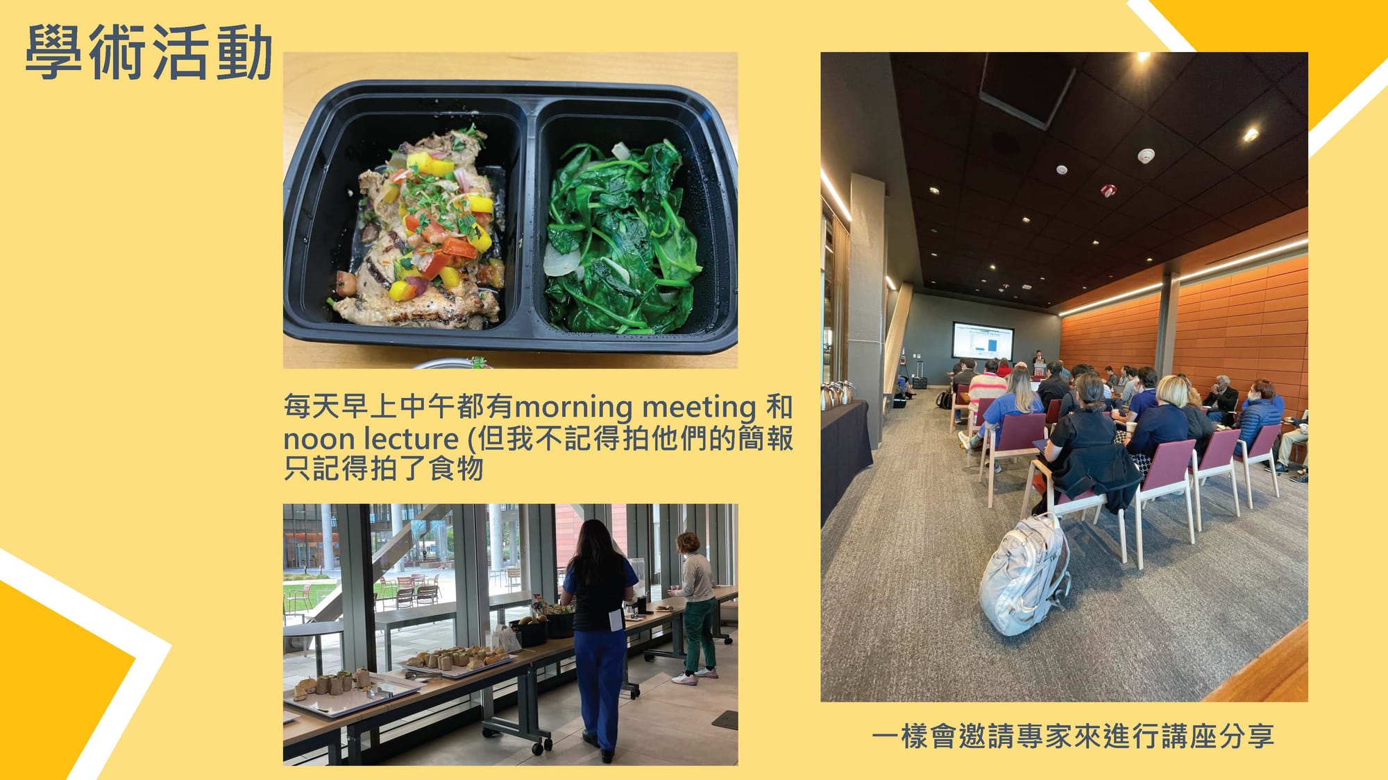 除了臨床實務,醫院也提供豐富的學術資源,如每日的 morning meeting、noon lecture,以及專家講座。在福利方面,實習生也能使用醫院休息室、健身房等設施,R1(第一年住院醫師)甚至每年有4–5週的休假,讓學習與生活得以平衡。
