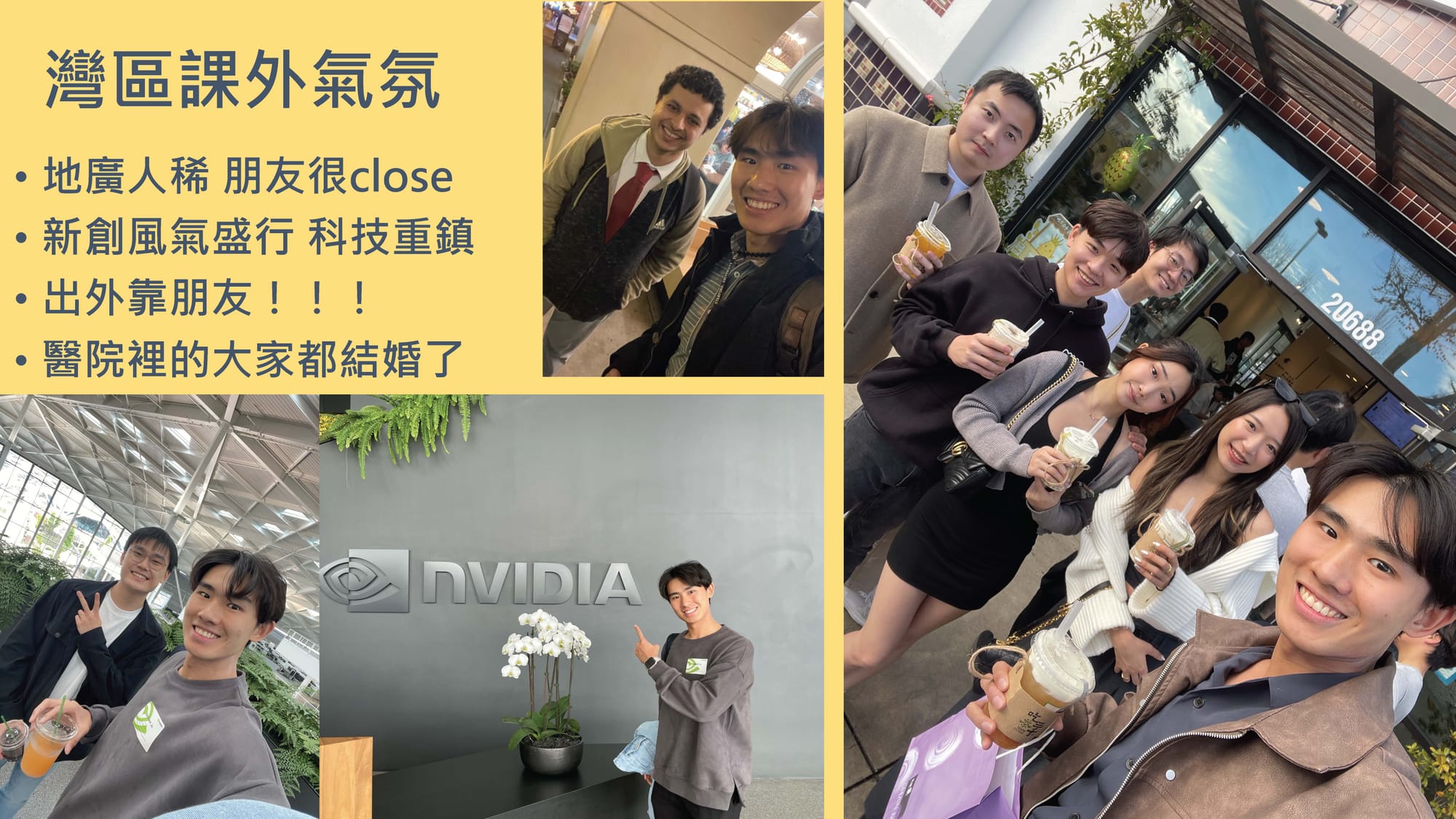 朱向晨學長也分享了在加州的生活樣貌。他提到當地地廣人稀,是科技產業密集的創新中心,人際關係緊密。由於生活與出遊高度仰賴朋友網絡,他也加入了史丹佛台灣學生會,藉此拓展交友圈。