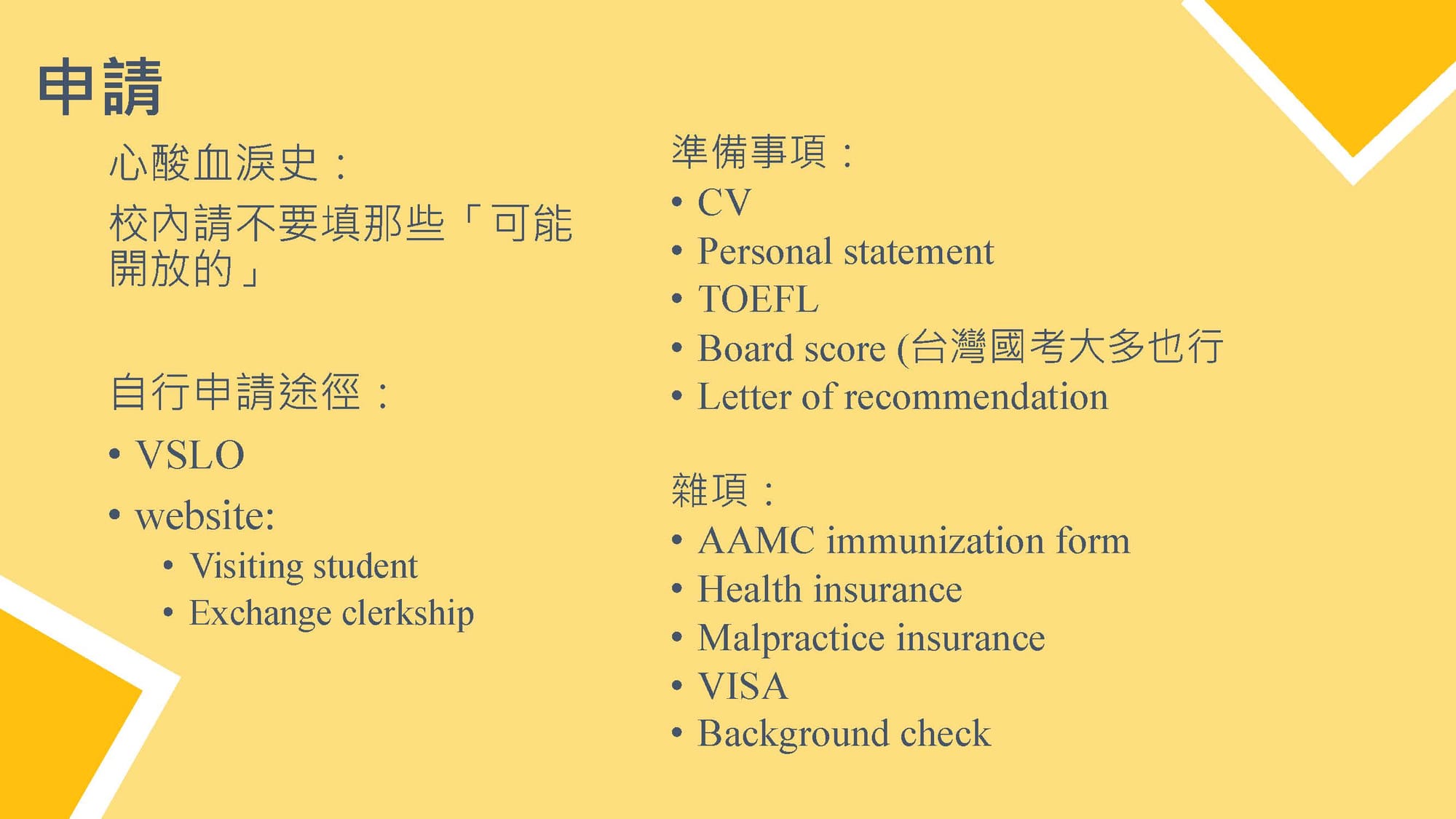 - 申請文件: 提早準備新制托福、個人自傳 (Personal Statement) 與履歷 (CV)、推薦信,若有計畫考 USMLE 也可先準備。