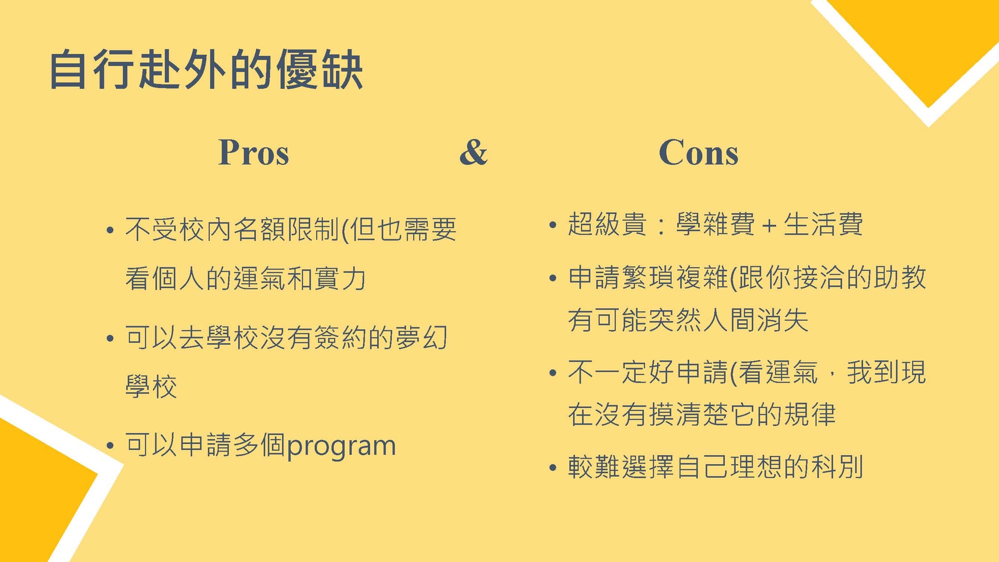 - 優點: 不受校內名額限制、可申請無合作的學校、能同時申請多個 program 增加機會。